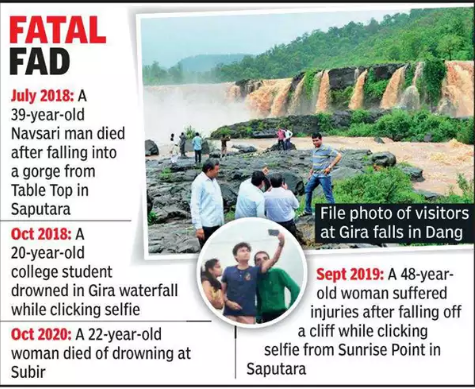 In an effort to reduce accidents caused by such activities, taking selfies has been considered a criminal violation in Gujarat’s Dang district, a prominent tourist destination which is known for its waterfalls and the lovely hill station Saputara.